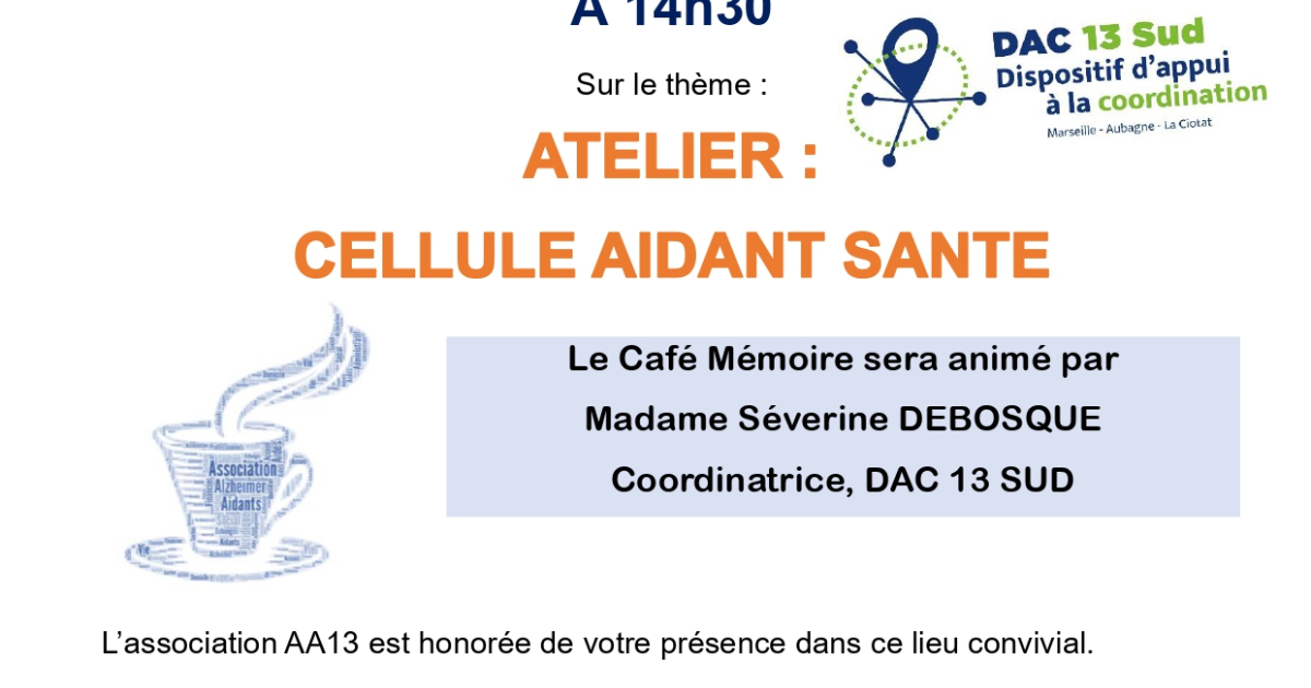 La Cellule Aidant Santé du DAC 13 Sud est heureuse de co-animer le prochain "Café nommé Mémoire" de l'Association Alzheimer Aidants, sur la thématique de la santé des aidants.